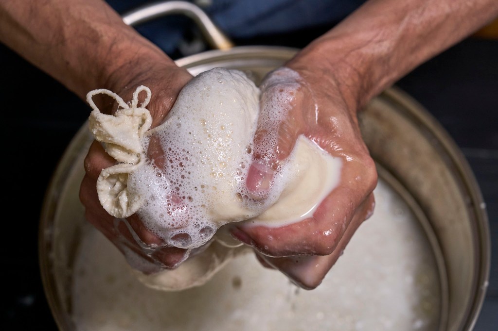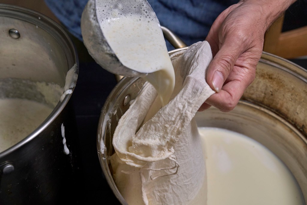 4,Use a cotton filter bag to separate the soybean pulp (okara) from the soy milk. Squeezing the soy milk from the pulp takes some effort — but it’s worth it! The drier the okara you squeeze out, the more pure soy milk you’ll get, which means a bigger yield of tofu in the end.