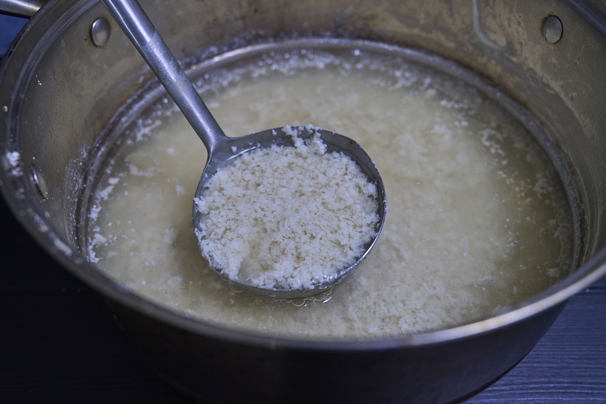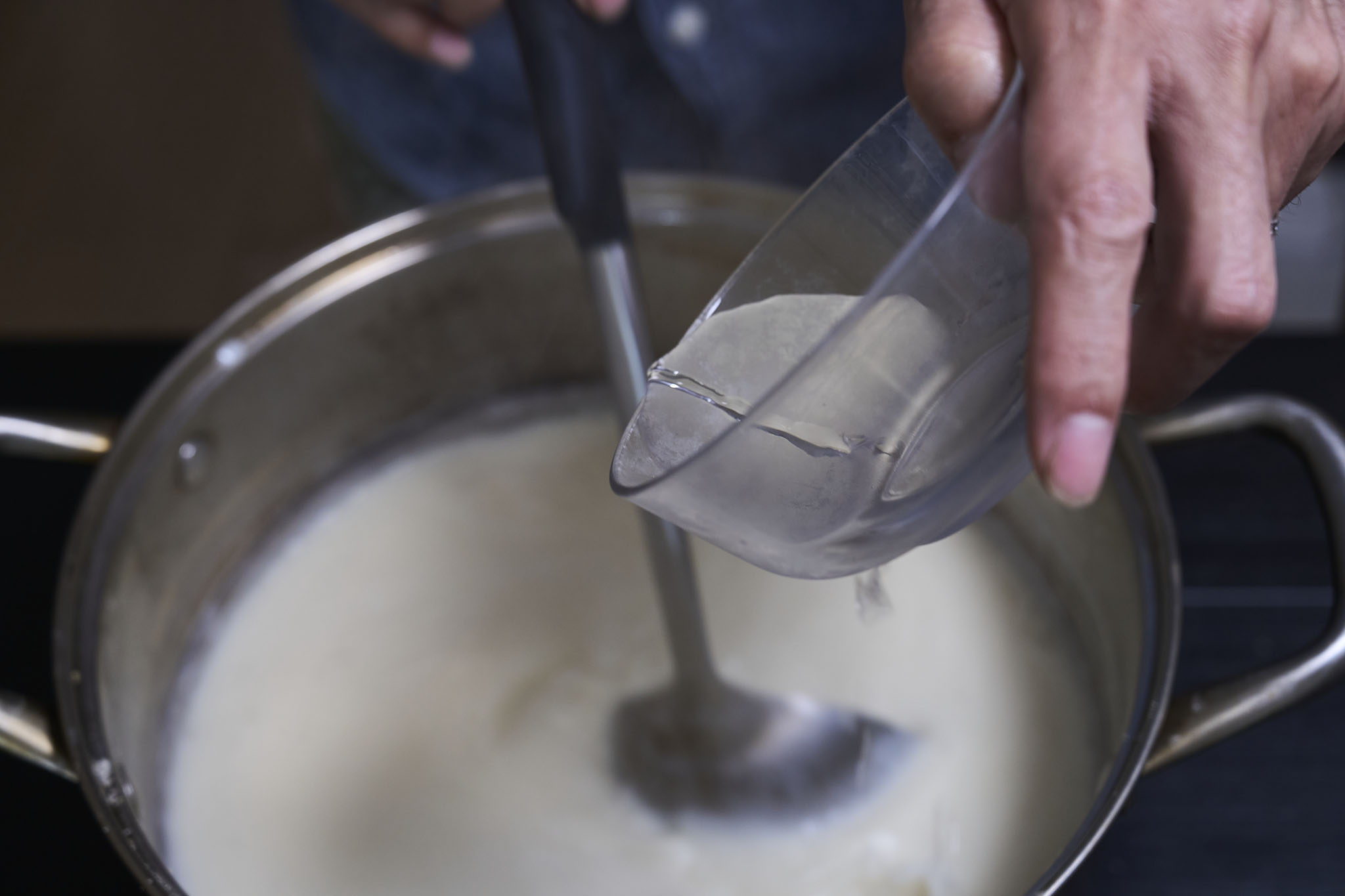 6,While waiting for the soy milk to cool to the right temperature, you can take this time to fully dissolve the dry coagulant (nigari) in water. Once the soy milk reaches around 80–85°C (176–185°F), it’s ready for coagulation — it’s time to add the coagulant.