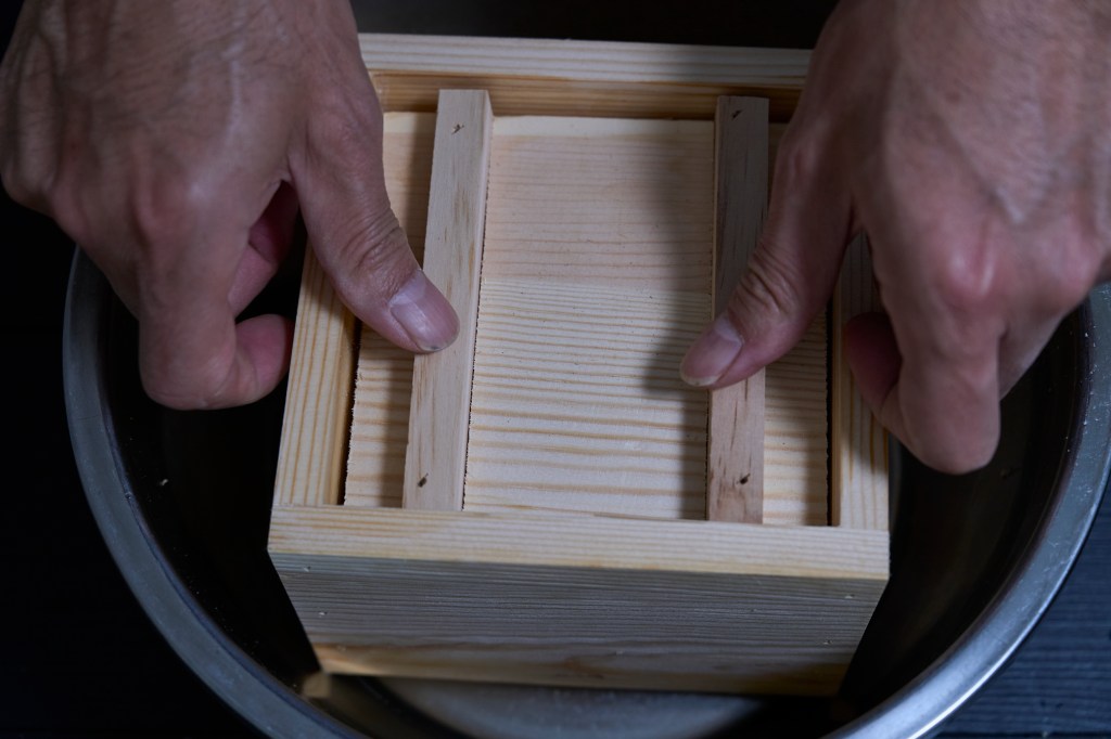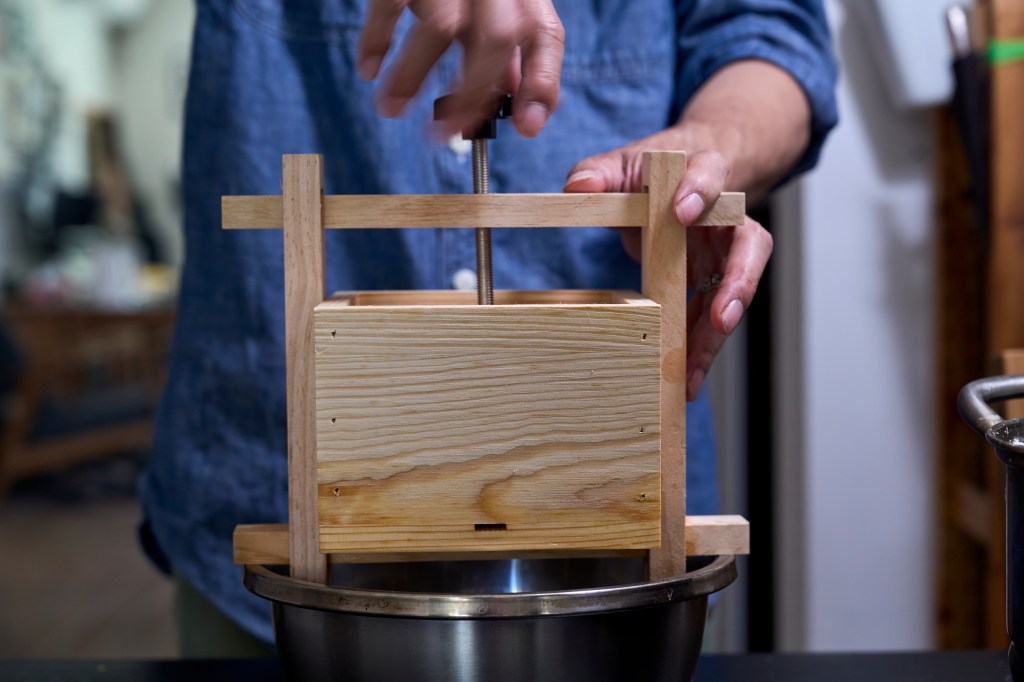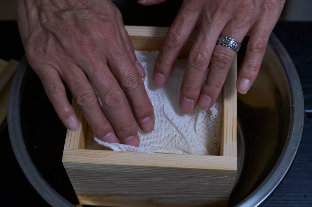 Gently lift the tofu out of the mold by holding the edges of the cloth. If you move too quickly and the freshly made tofu breaks apart, don’t worry — simply place it back into the mold and press it again.