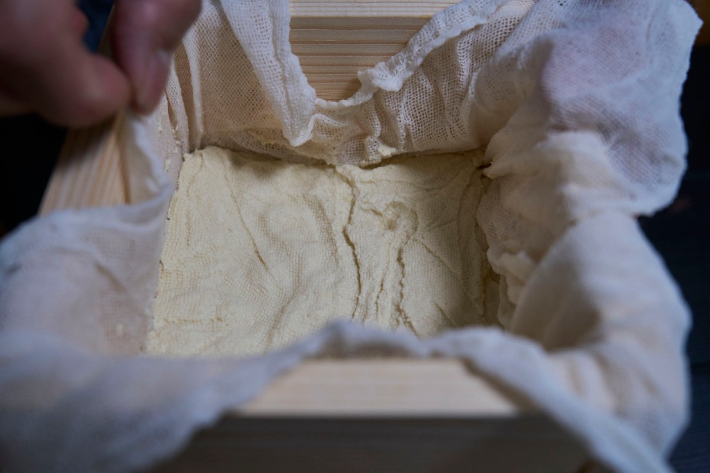 Once all the tofu curds have been poured into the mold, fold the edges of the cheesecloth neatly over the top to cover it. Place the lid on, then apply pressure — this helps press out the remaining moisture and shape the tofu into a firm block.
