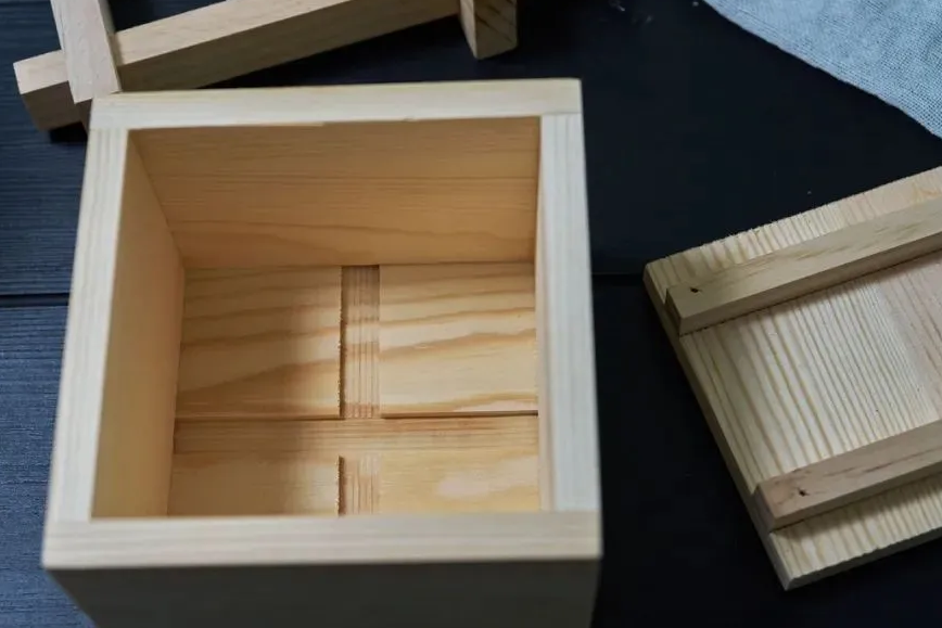 7,This is a small wooden tofu mold — I bought it partly because I thought it was cute, and partly out of a romantic idea that maybe a subtle wood aroma would linger in the finished tofu.