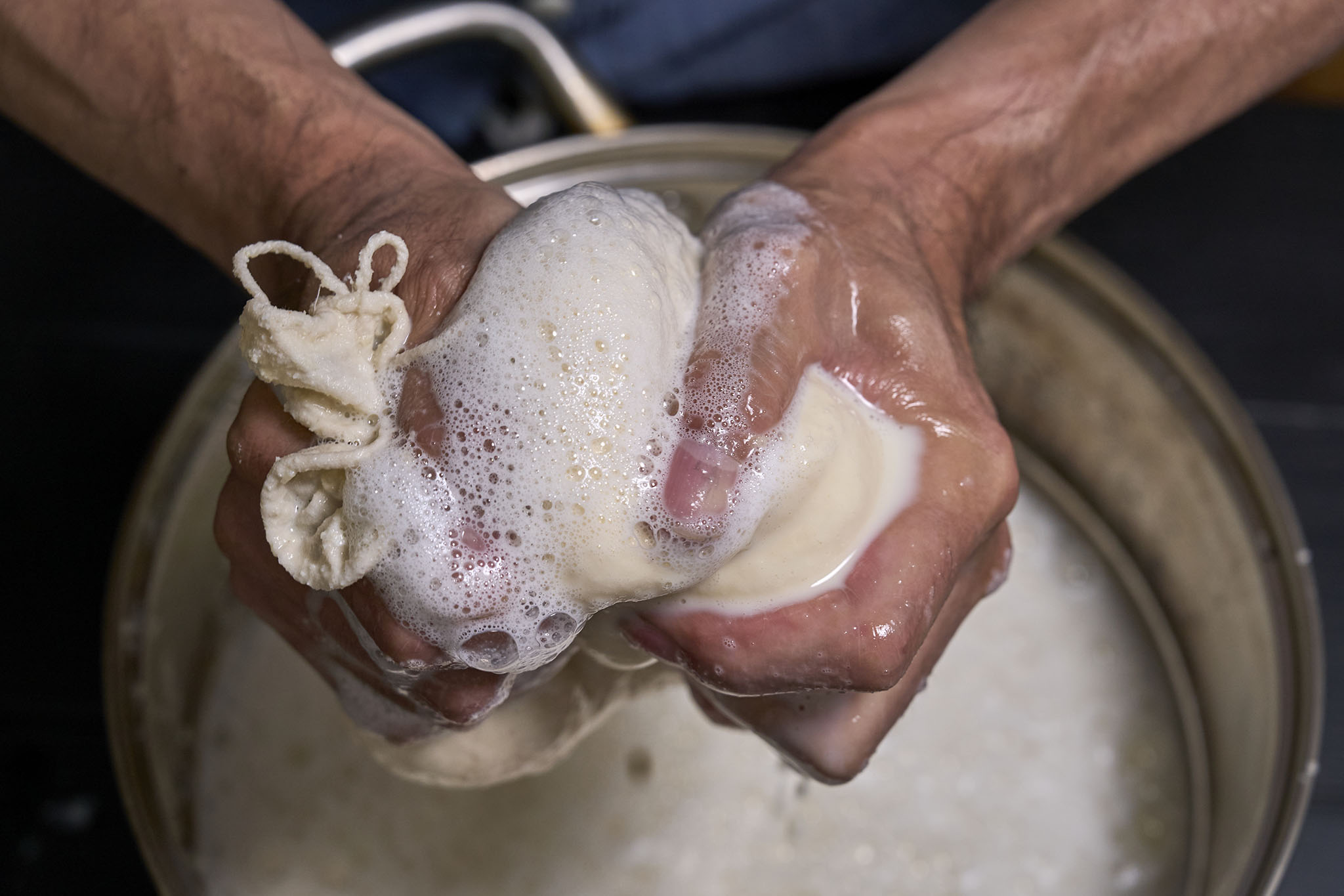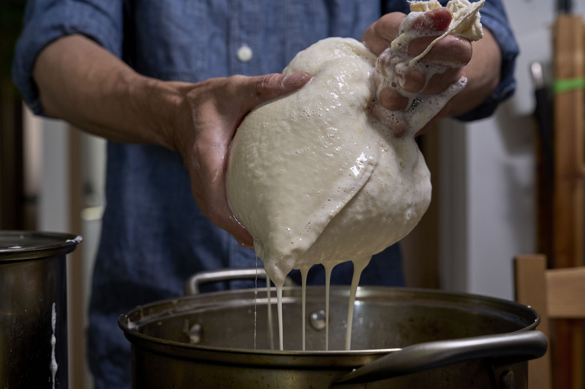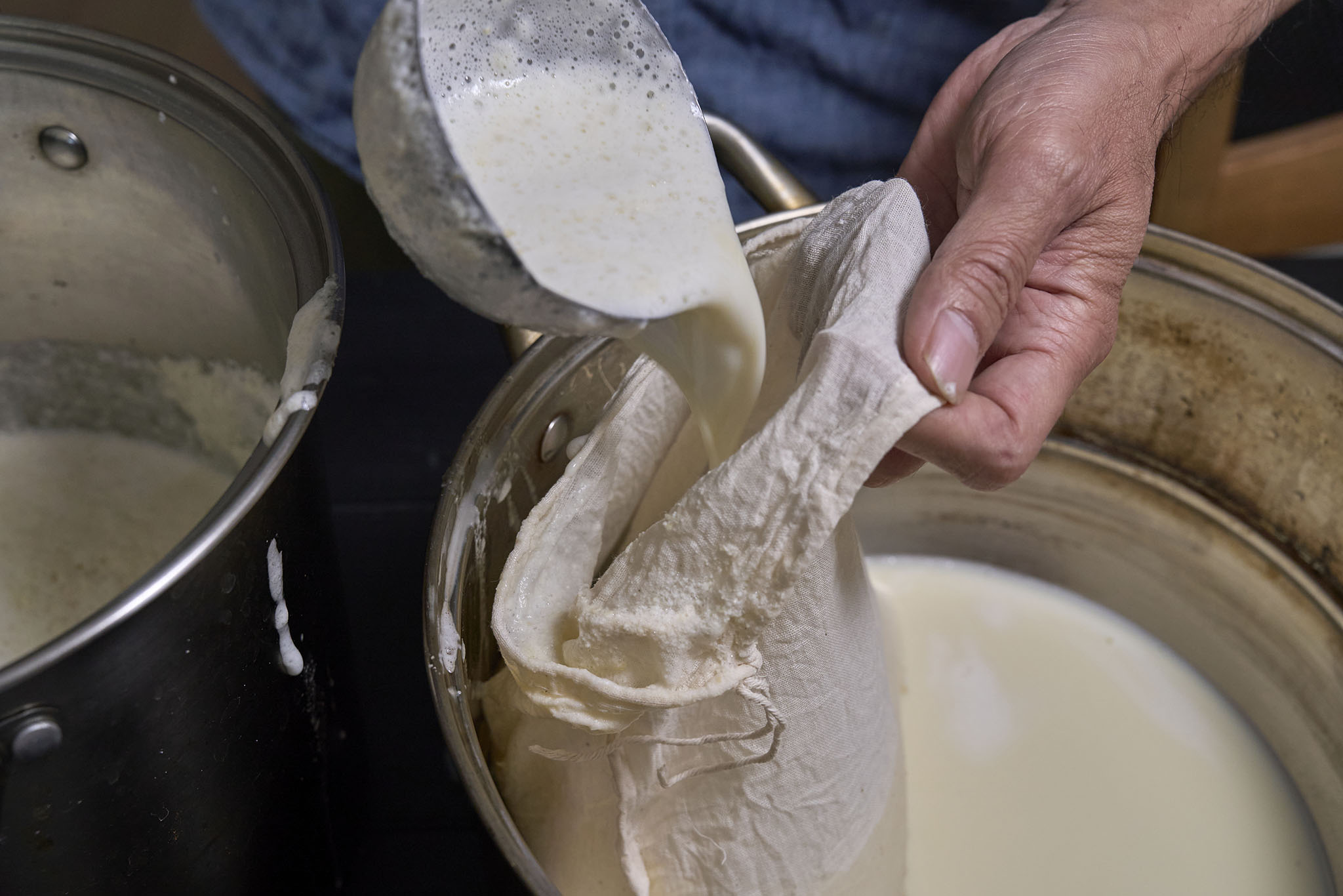 4,Use a cotton filter bag to separate the soybean pulp (okara) from the soy milk. Squeezing the soy milk from the pulp takes some effort — but it’s worth it! The drier the okara you squeeze out, the more pure soy milk you’ll get, which means a bigger yield of tofu in the end.