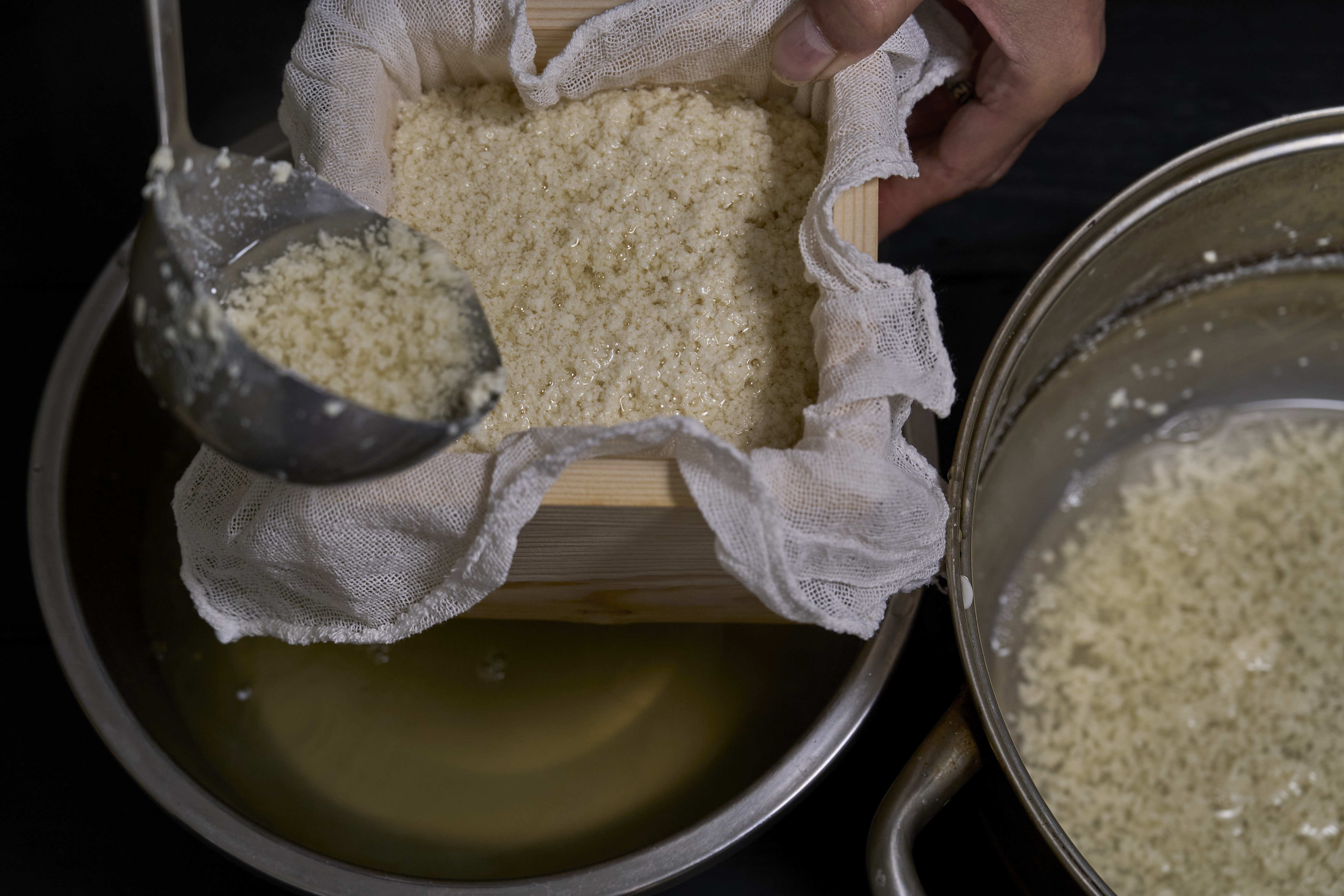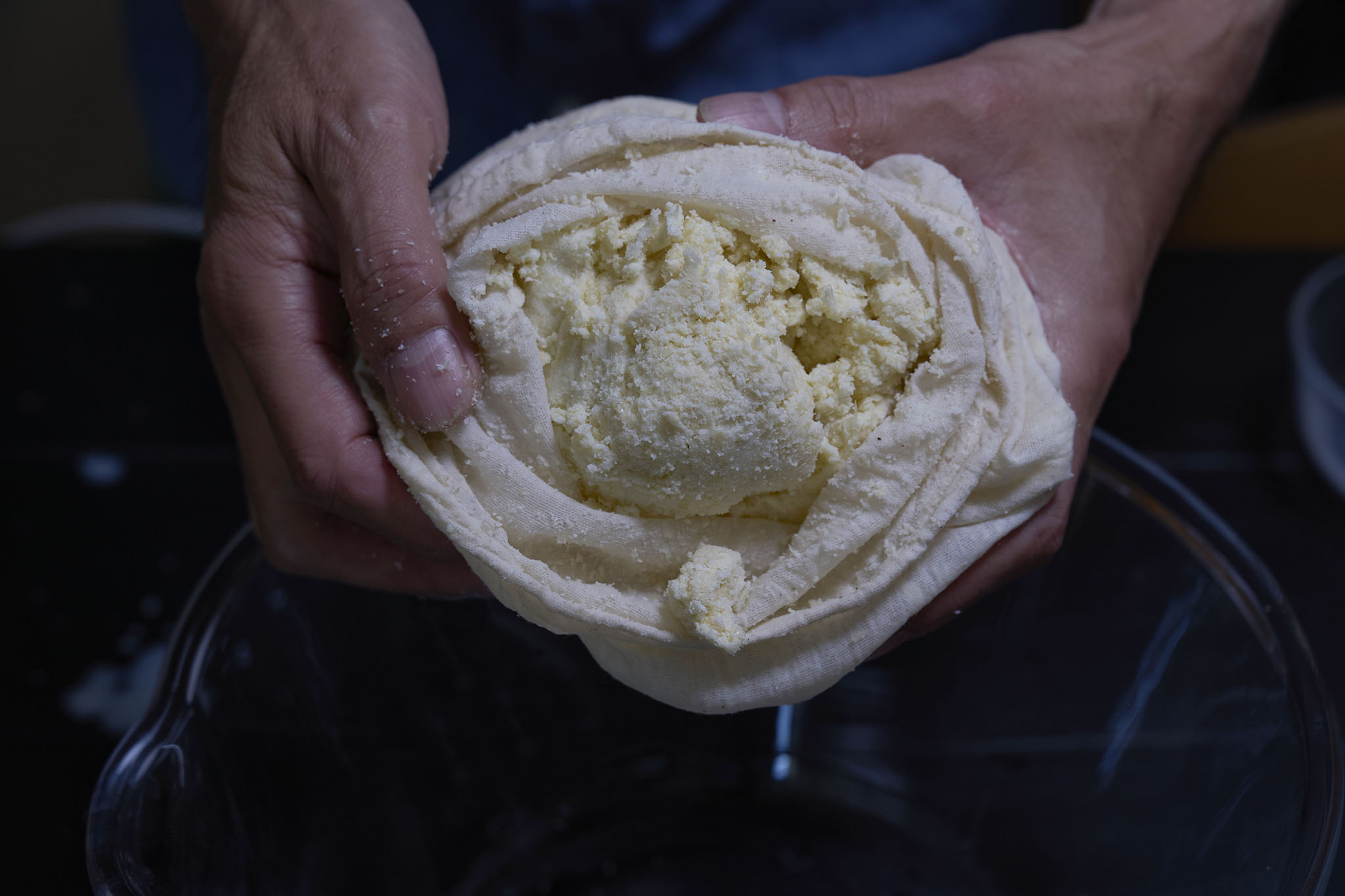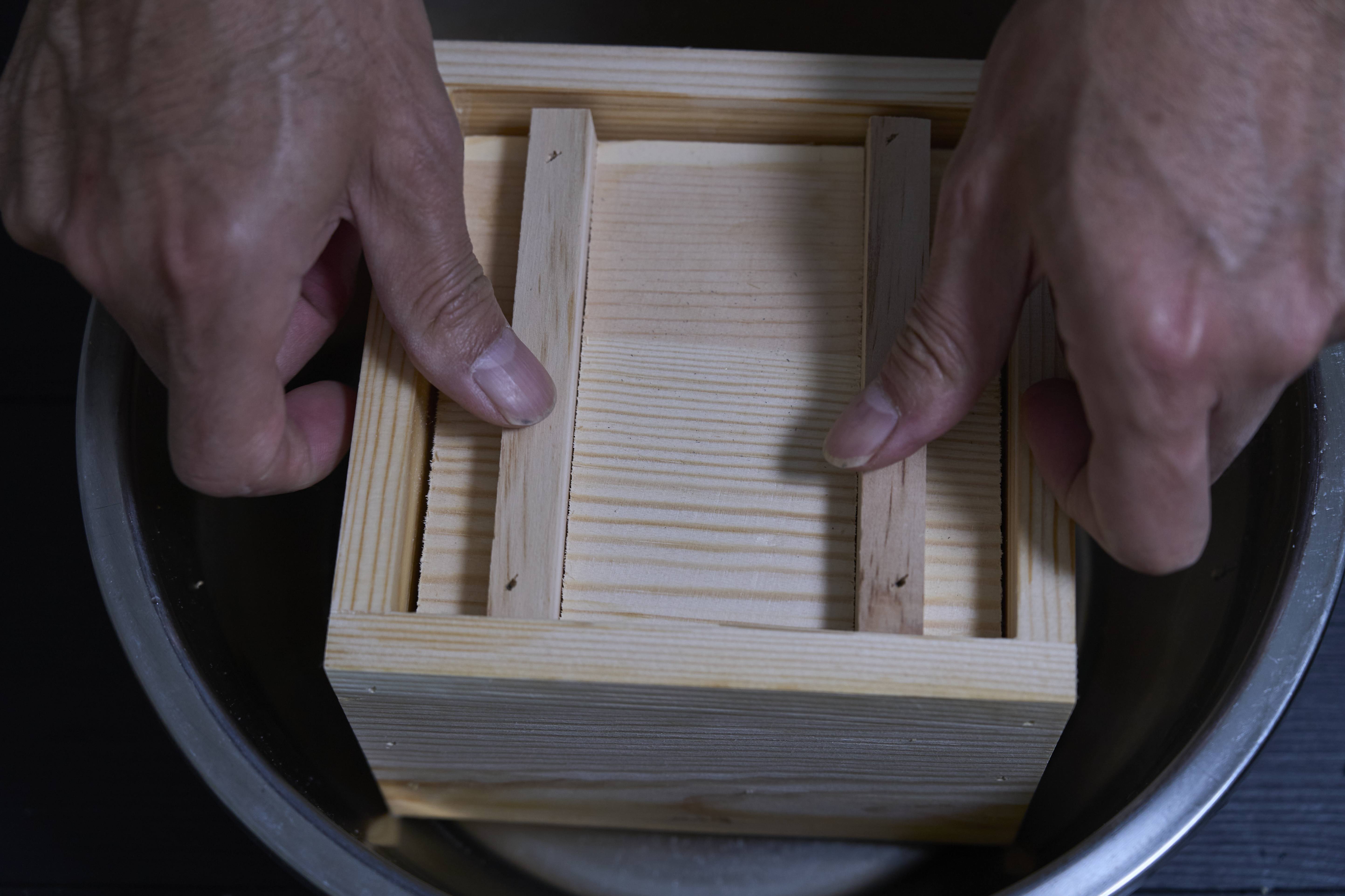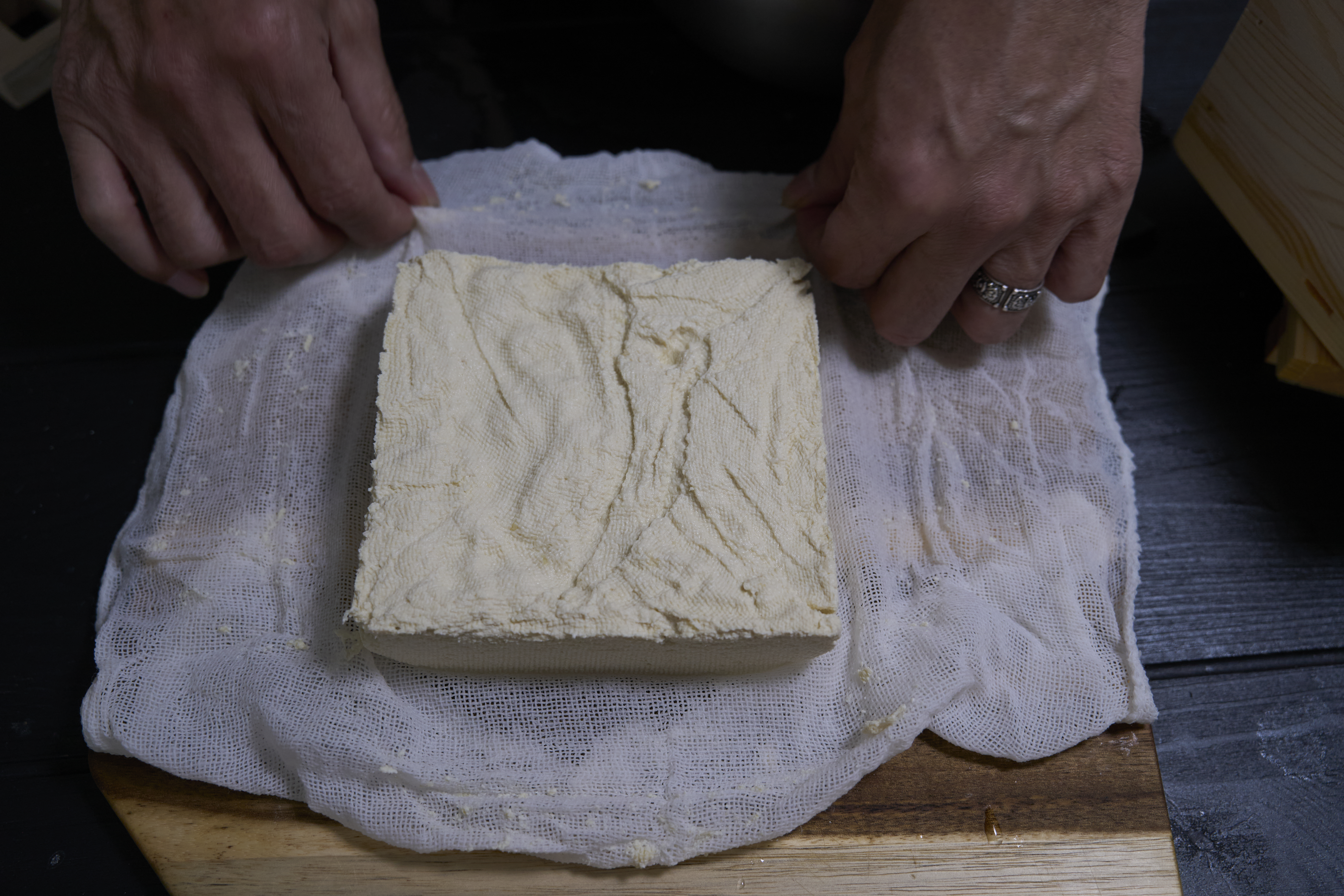 Gently lift the tofu out of the mold by holding the edges of the cloth. If you move too quickly and the freshly made tofu breaks apart, don’t worry — simply place it back into the mold and press it again.