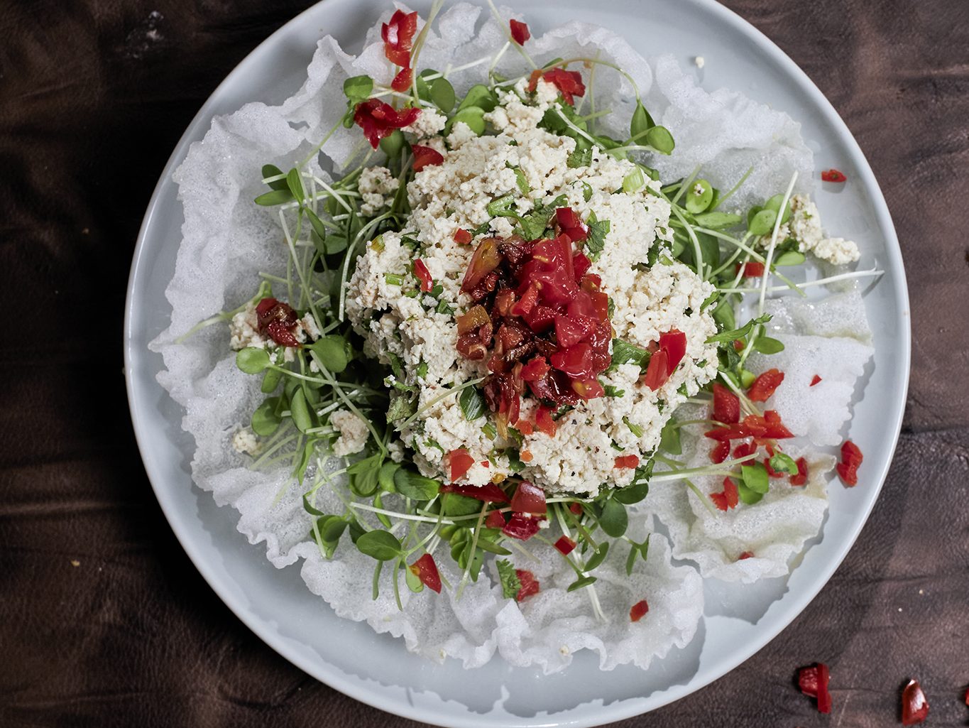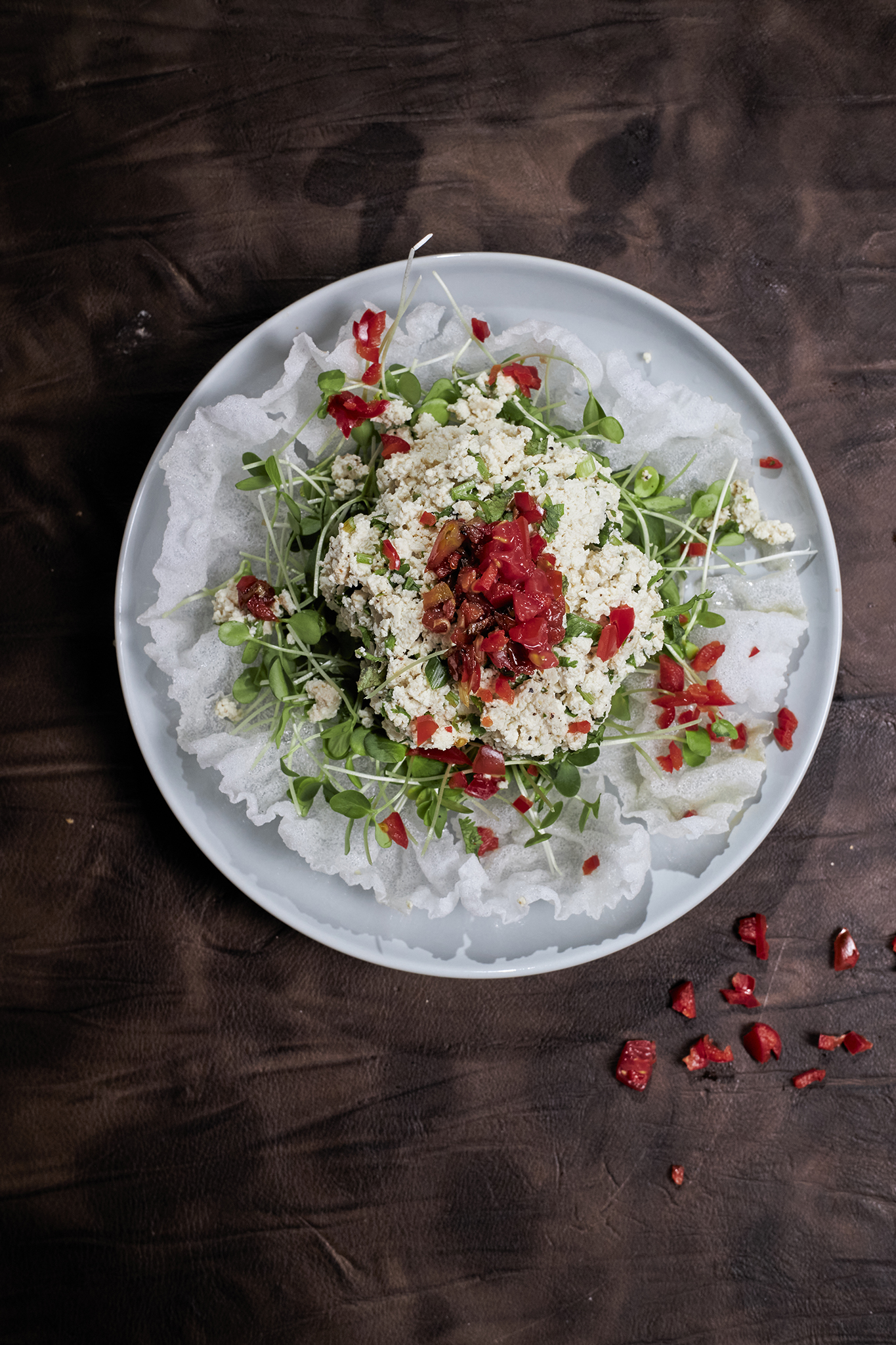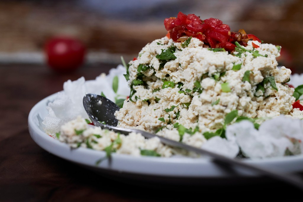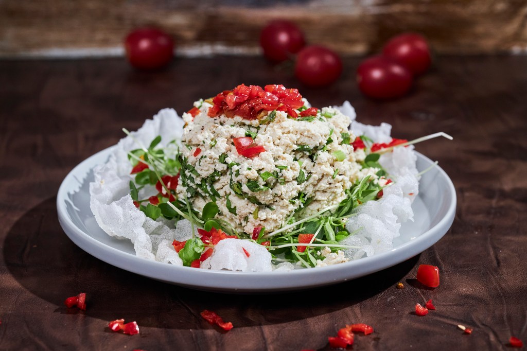 5. Arrange the bowl of crumbled tofu, the Xiangchun sprouts, and the warm tomato-pepper sauce on a plate in a form as you like.