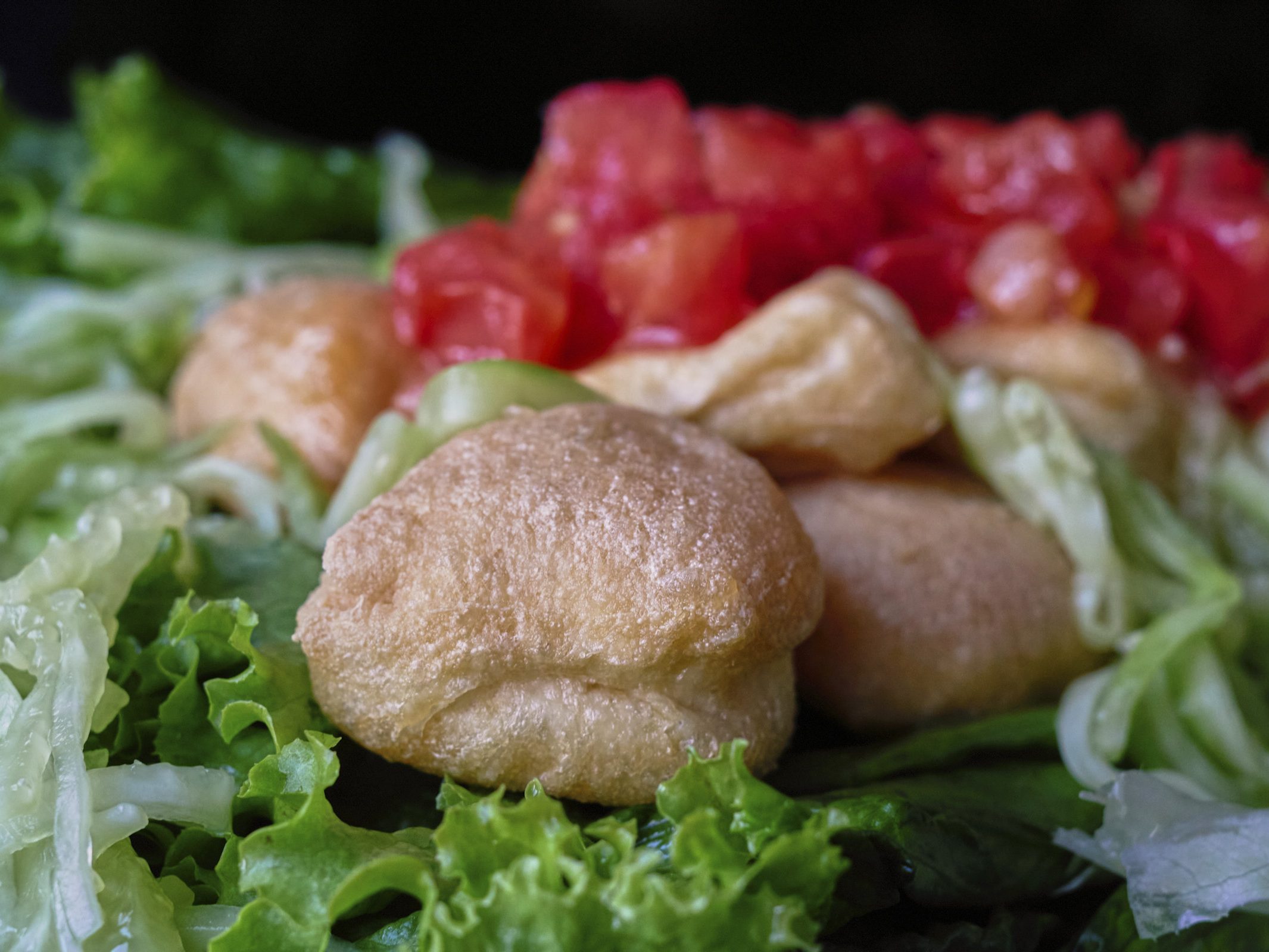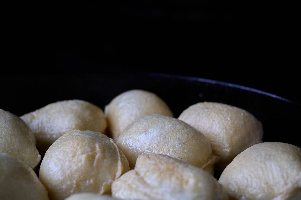 1,Yunnan Tofu might look a bit like traditional fried tofu puffs, but they’re quite different. The inside of Yunnnan tofu remains as airy as whipped cream, while the inner texture of fried tofu puff is more like gluten. And the outer skin of Yunnan tofu doesn’t turn tough after frying, but instead develops a very thin golden crust wrapping the sweetness of soy protein—something fried tofu puffs can’t quite replicate.
