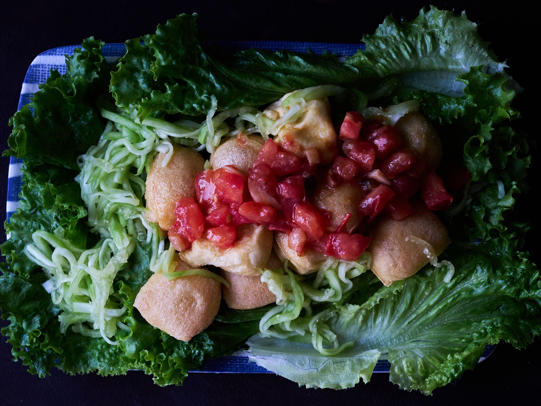 8. On a serving plate, lay down the lettuce as a base, then pile on the salted cucumber strips. Stack the golden tofu cubes on top, and spoon the tomato dressing over everything.