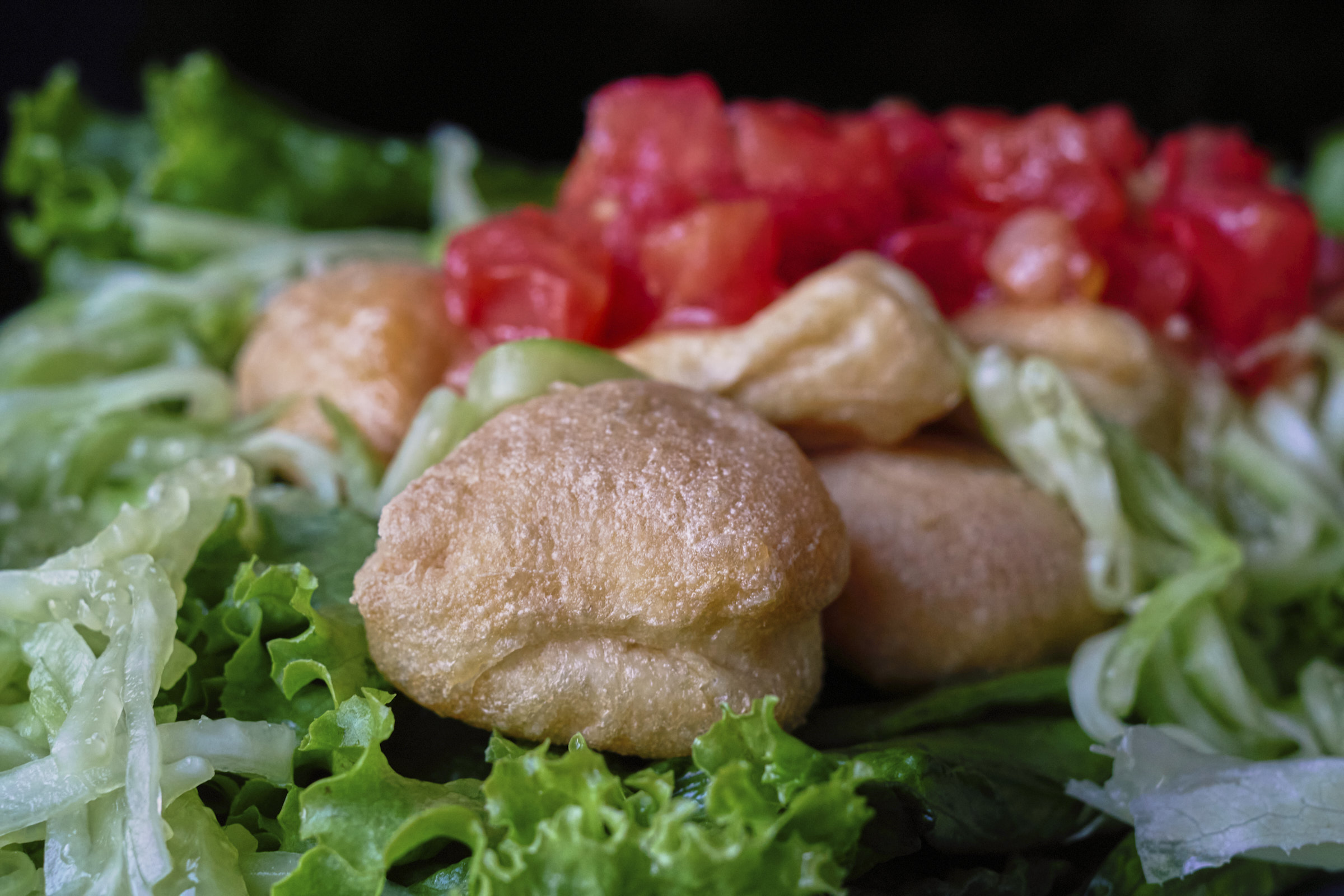 1,Yunnan Tofu might look a bit like traditional fried tofu puffs, but they’re quite different. The inside of Yunnnan tofu remains as airy as whipped cream, while the inner texture of fried tofu puff is more like gluten. And the outer skin of Yunnan tofu doesn’t turn tough after frying, but instead develops a very thin golden crust wrapping the sweetness of soy protein—something fried tofu puffs can’t quite replicate.