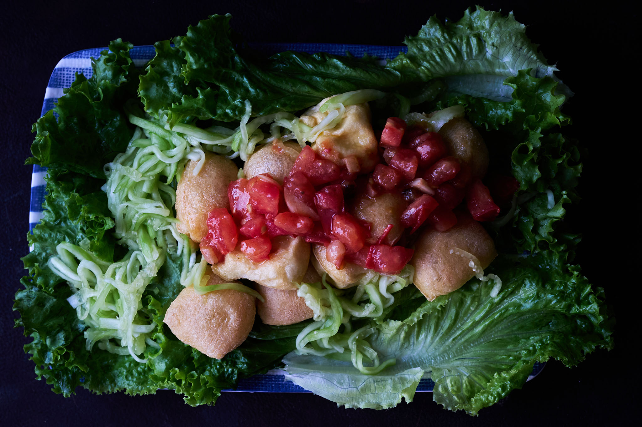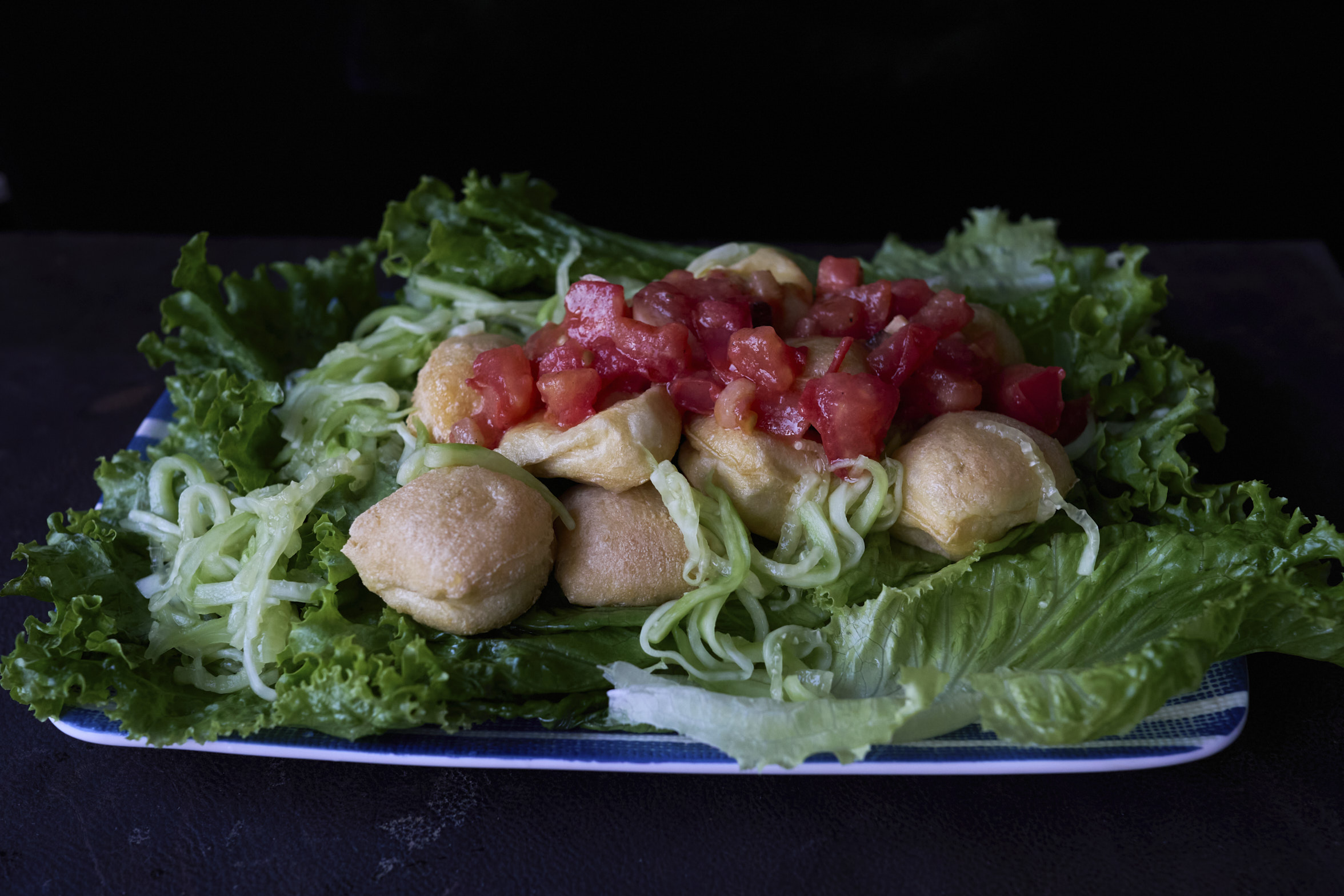 8. On a serving plate, lay down the lettuce as a base, then pile on the salted cucumber strips. Stack the golden tofu cubes on top, and spoon the tomato dressing over everything.