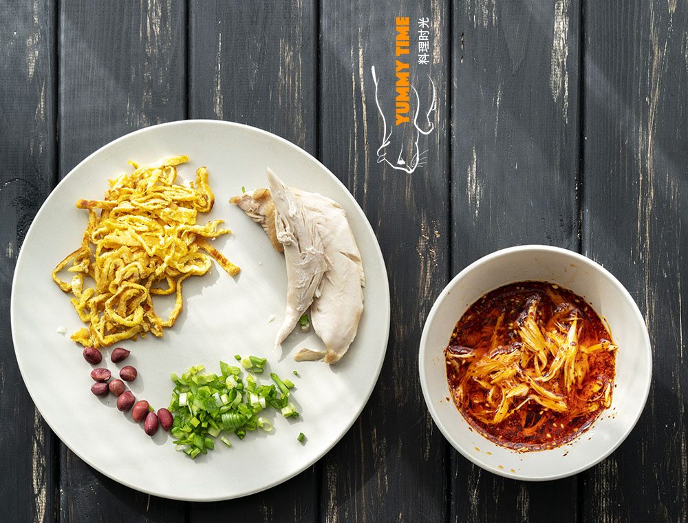 After blanching the rice noodles in boiling water, place into a bowl, ladled with chicken broth, and topped with shredded chicken in chili oil, diced cooked bell peppers, thinly sliced egg crepe, and a handful of crispy peanuts.