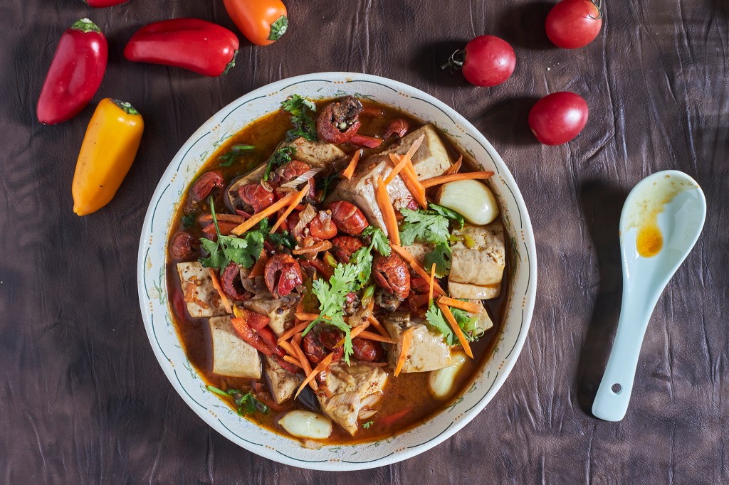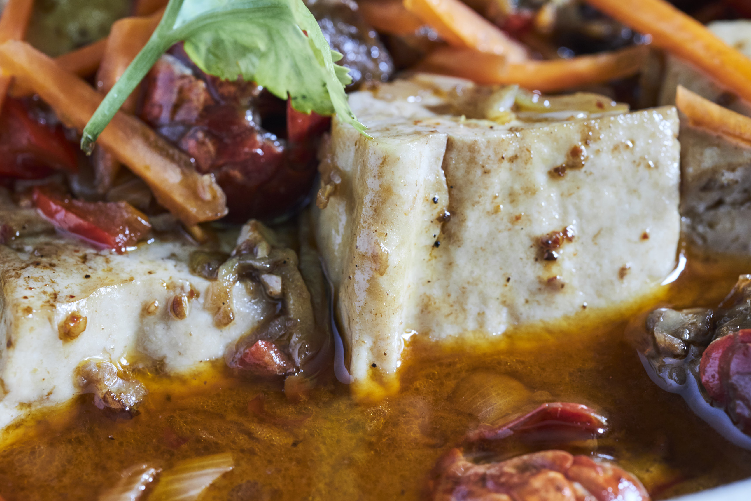 - As the sauce becomes thicker and richer, the tofu absorbs its full flavor. Finish with a sprinkle of shredded carrots and fresh cilantro leaves. Turn off the heat and serve on table.