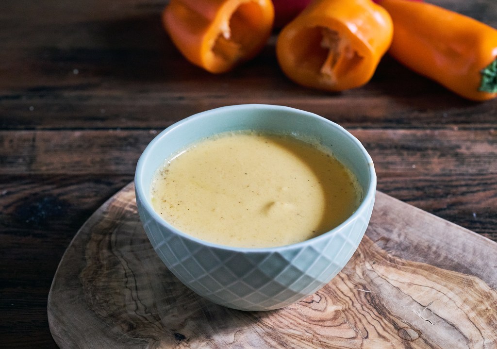 4,Add the bellpepper–mushroom mixture into the tofu purée. Blend together until full combination, a golden creamy dressing.