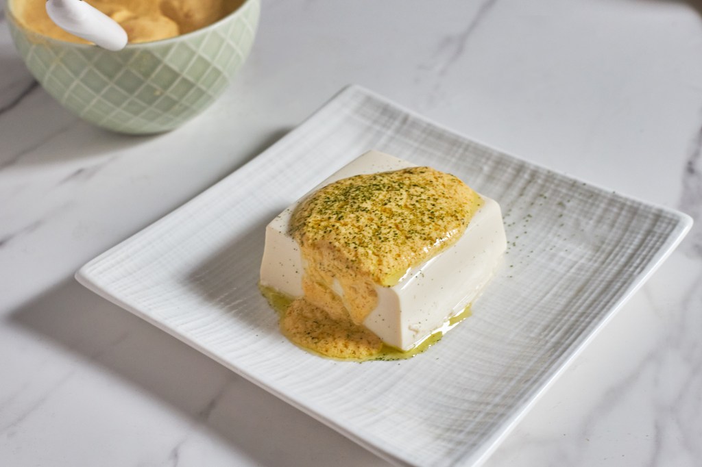 Now, pour the finished dressing over the remaining half block of tofu, you will make yourself a healthy, refreshing, and sweet summer treat.