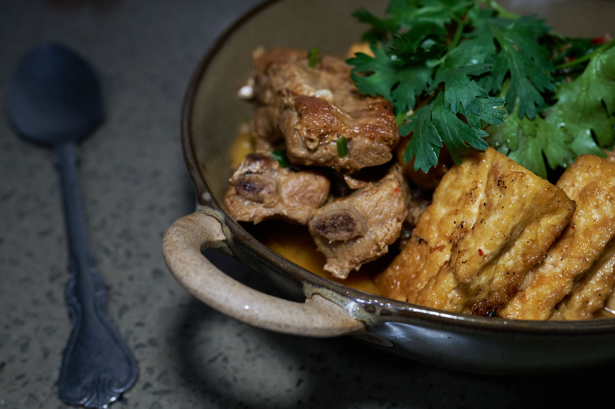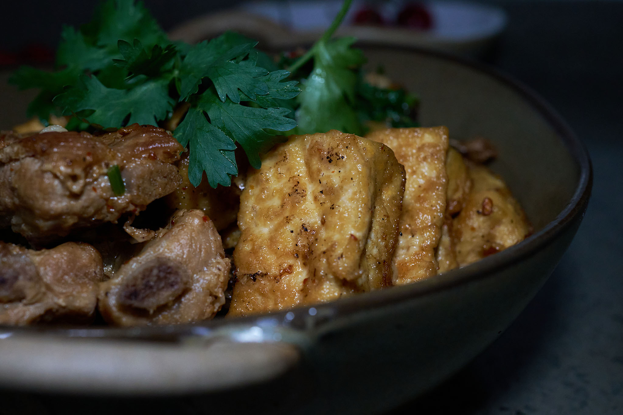 - When the broth thickens and the aroma deepens, take out the ribs and tofu to a serving plate. Into the remaining sauce in the wok, drizzle a little olive oil, scatter cilantro leaves, and let it simmer for another minute or two to condense into a rich, glossy braising sauce.