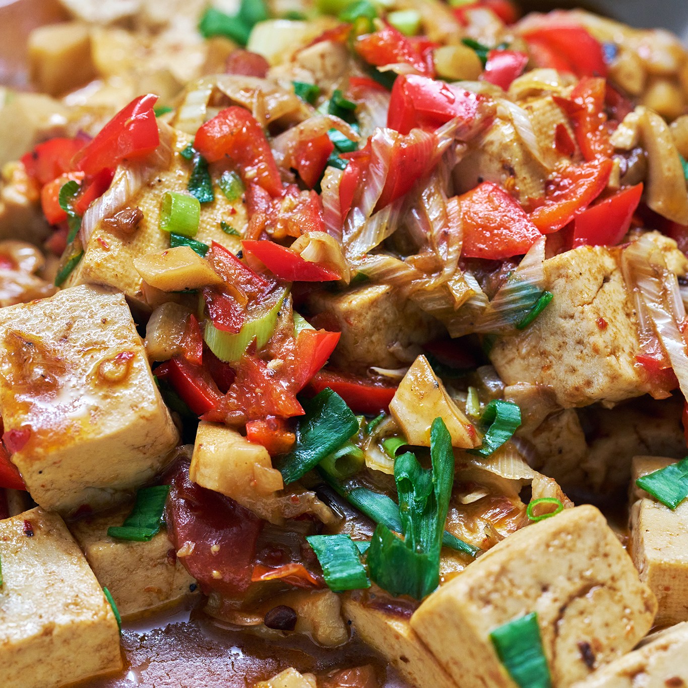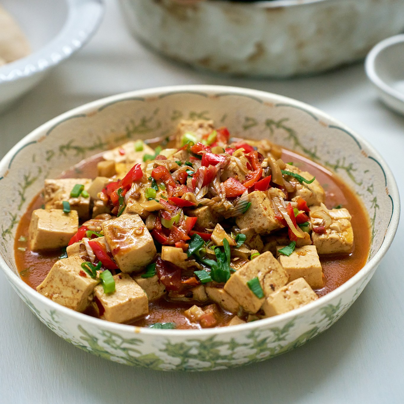 Beside a deep fermented flavor of Doubanjiang Sauce, this tofu dish has a gentle sweetness from fruity peppers, as well as a touch of fresh ocean umami brought by the dried shrimp.