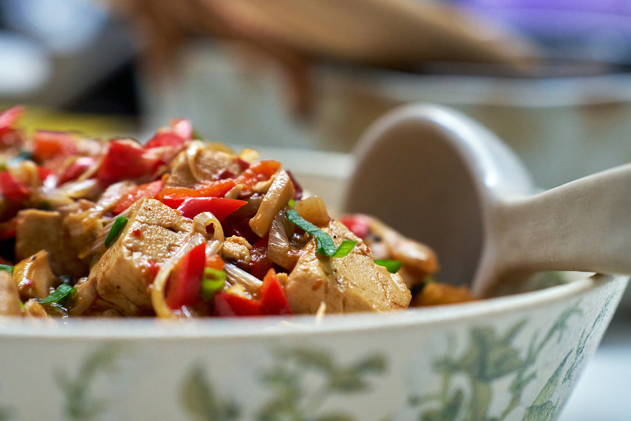 The sweet peppers are added in two stages, each with a different effect. The first round releases sweetness into the broth. The second addition keeps their fresh and crisp.