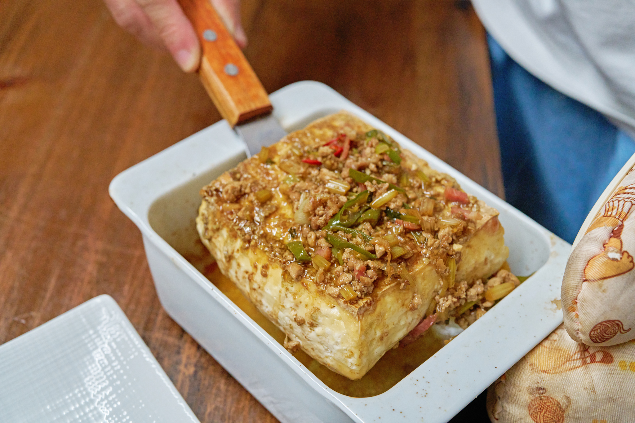 - Take out the baked tofu and cover it with the marinated meat mince along with savory sauce. Return to the oven and bake again at 230 °C for about 10 minutes. During this stage, the tofu will fully absorb the savory meat gravy and nutty sauce.