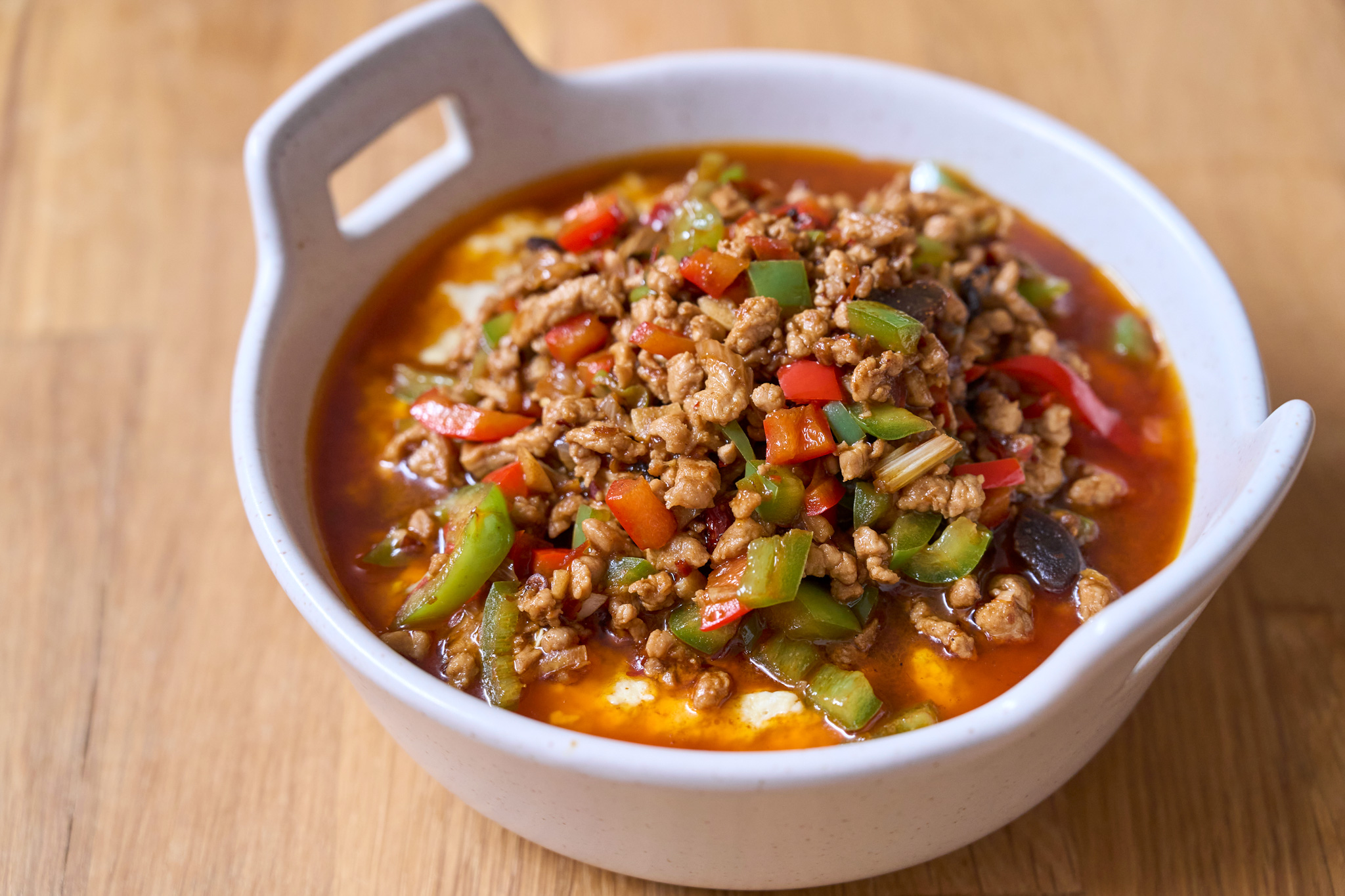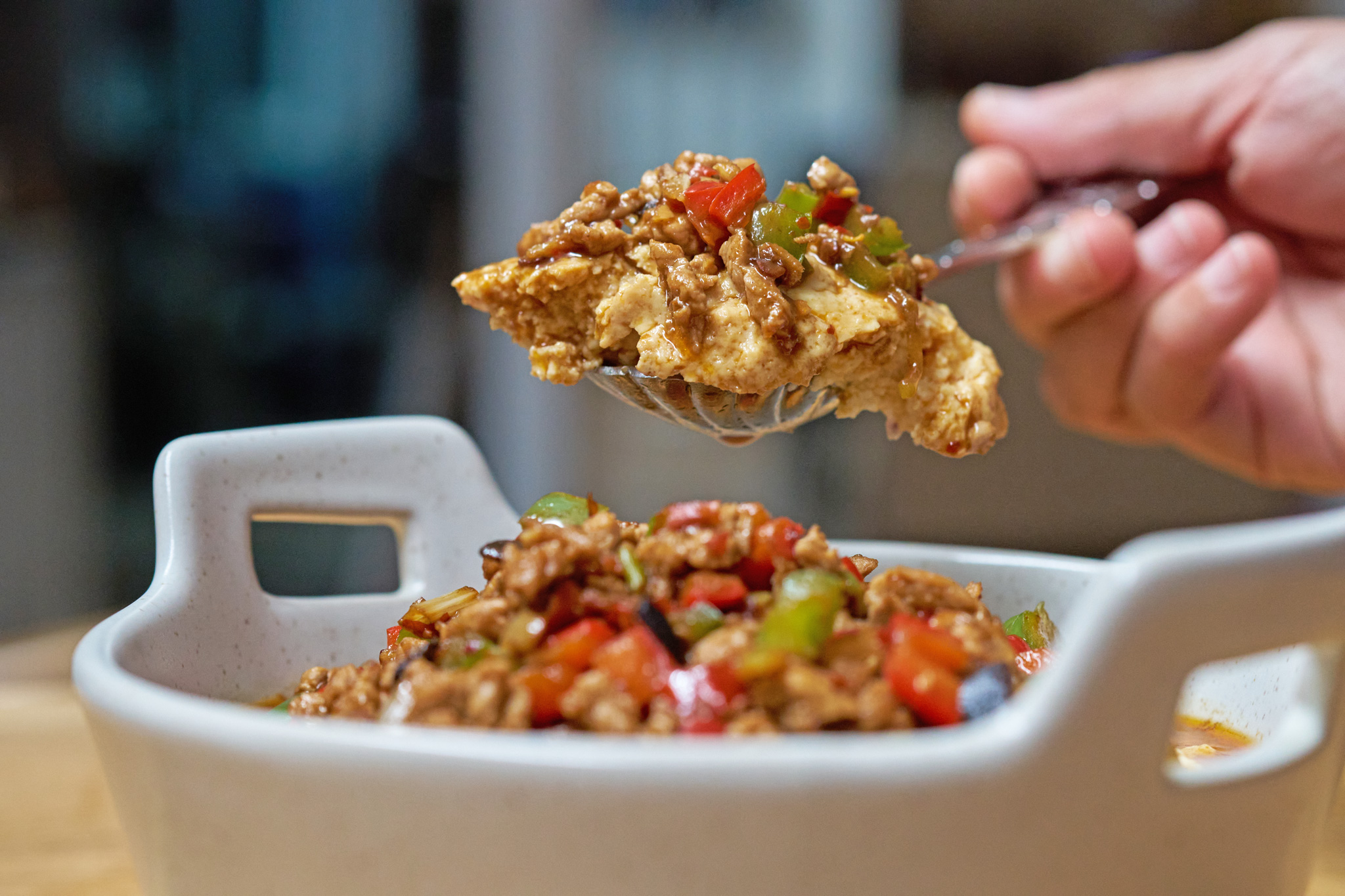 Today’s dish, Steamed Egg and Tofu Custard with Savory Minced Meat Sauce, began with a simple thought: “Let’s make something with tofu and eggs.” And a new idea was born.