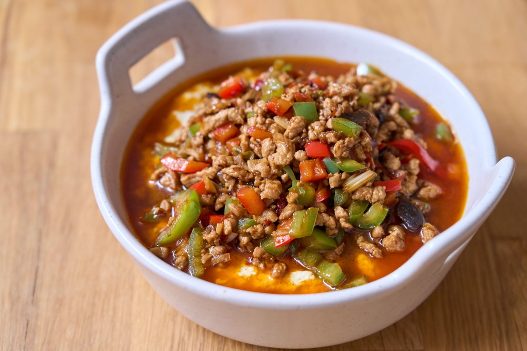 - Pour the minced meat sauce over the steamed tofu–egg custard.
