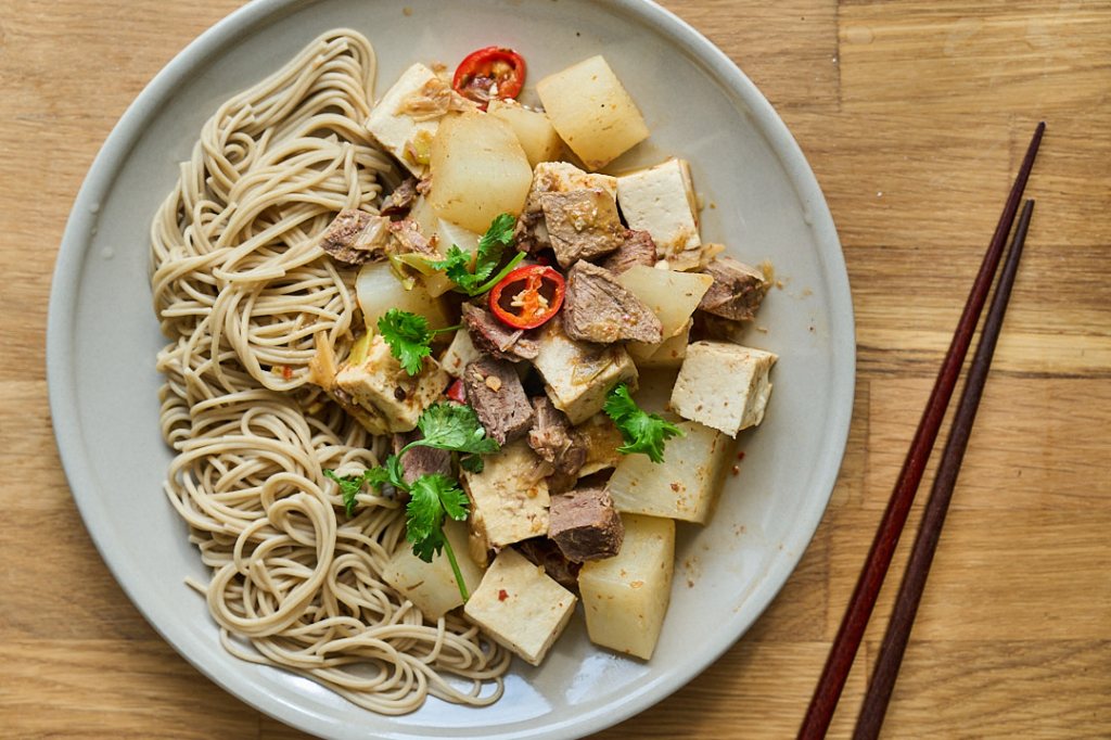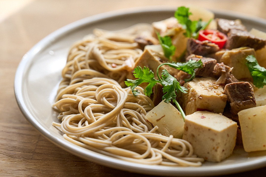We cut the beef into small pieces, simmered it with ginger, dried chilies, and cooking wine to make a rich broth. Then we added diced white radish and continued to cook until its aroma filled the pot. Finally, put chunks of tofu to soak up the flavorful soup as it thickened and concentrated — the perfect topping for our highland barley noodles.
