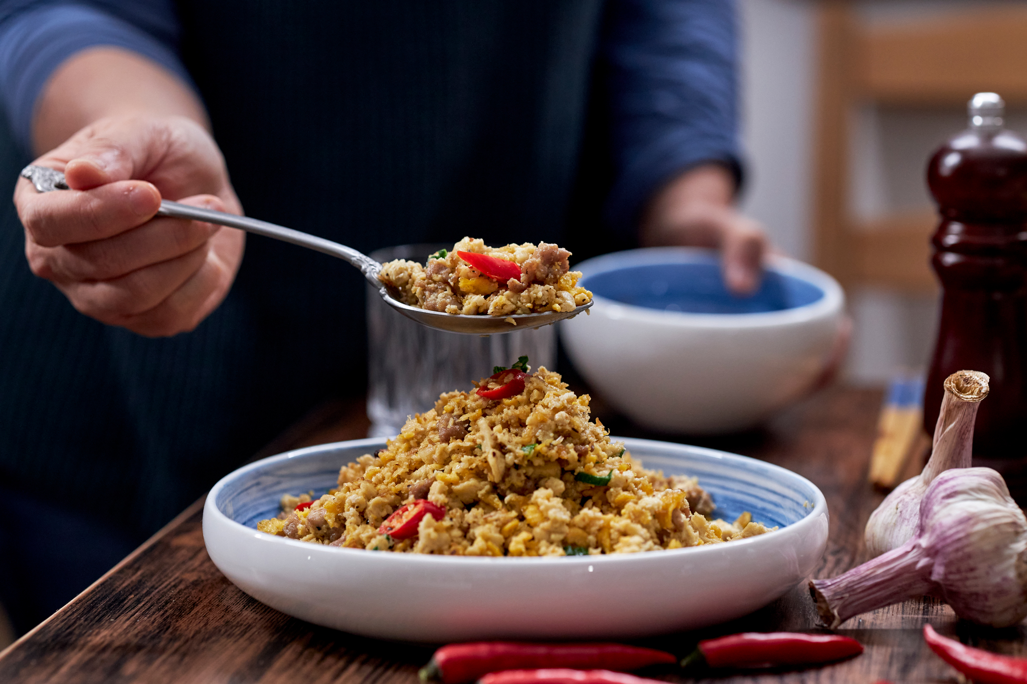 Once the pork and tofu mixture is fully cooked and well combined, add the egg-and-fish-roe mixture back into the pan. Toss in chopped garlic shoots and red chili. Season with a little salt.