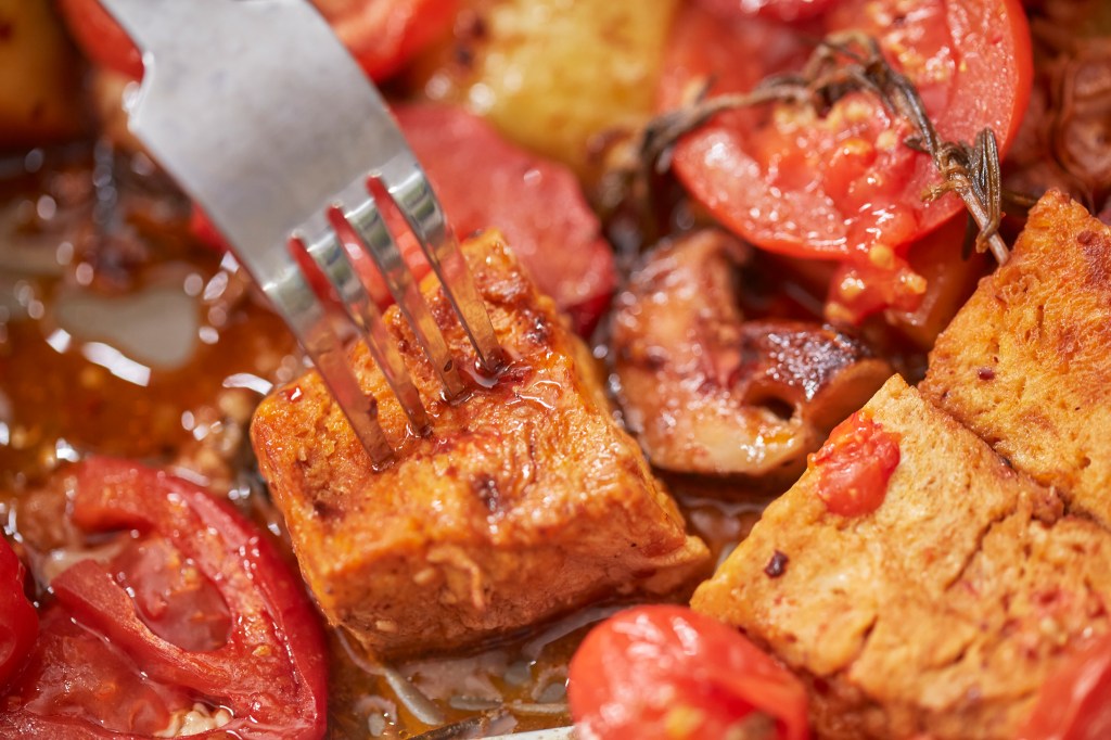 During this ‘steam-bake’ stage, the ingredients release their juices as they heat up, while the frozen tofu expands, opening up tiny pores that soak up all the sauce.