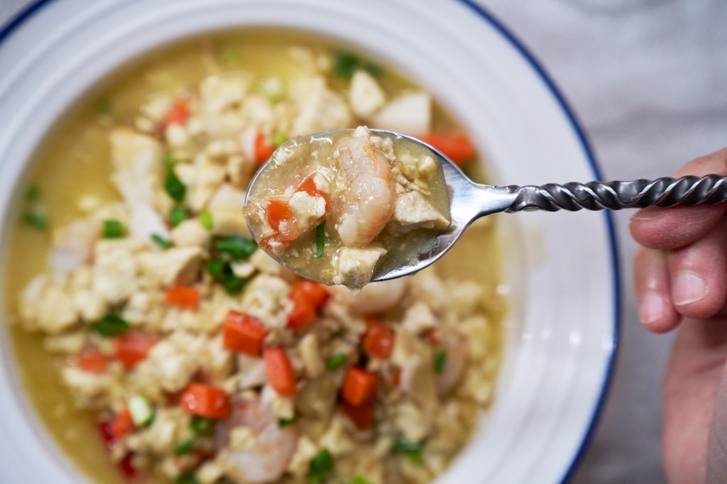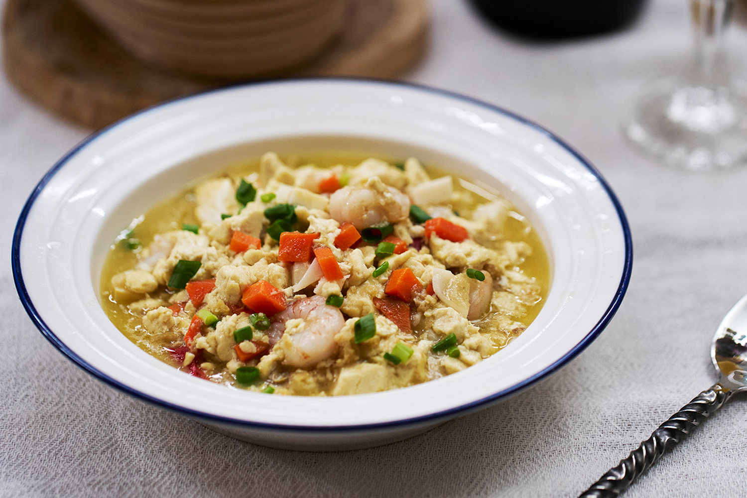 Fresh tofu, Shrimp, White fungus (tremella) soup, Diced winter bamboo shoots, Red chili, Diced carrot