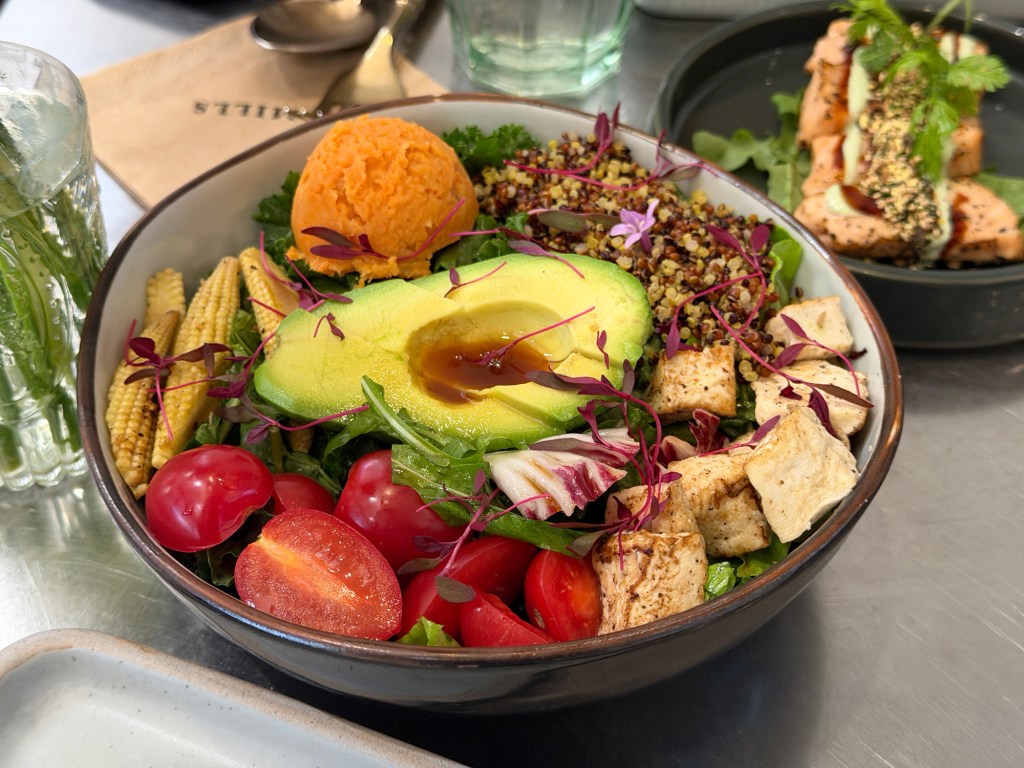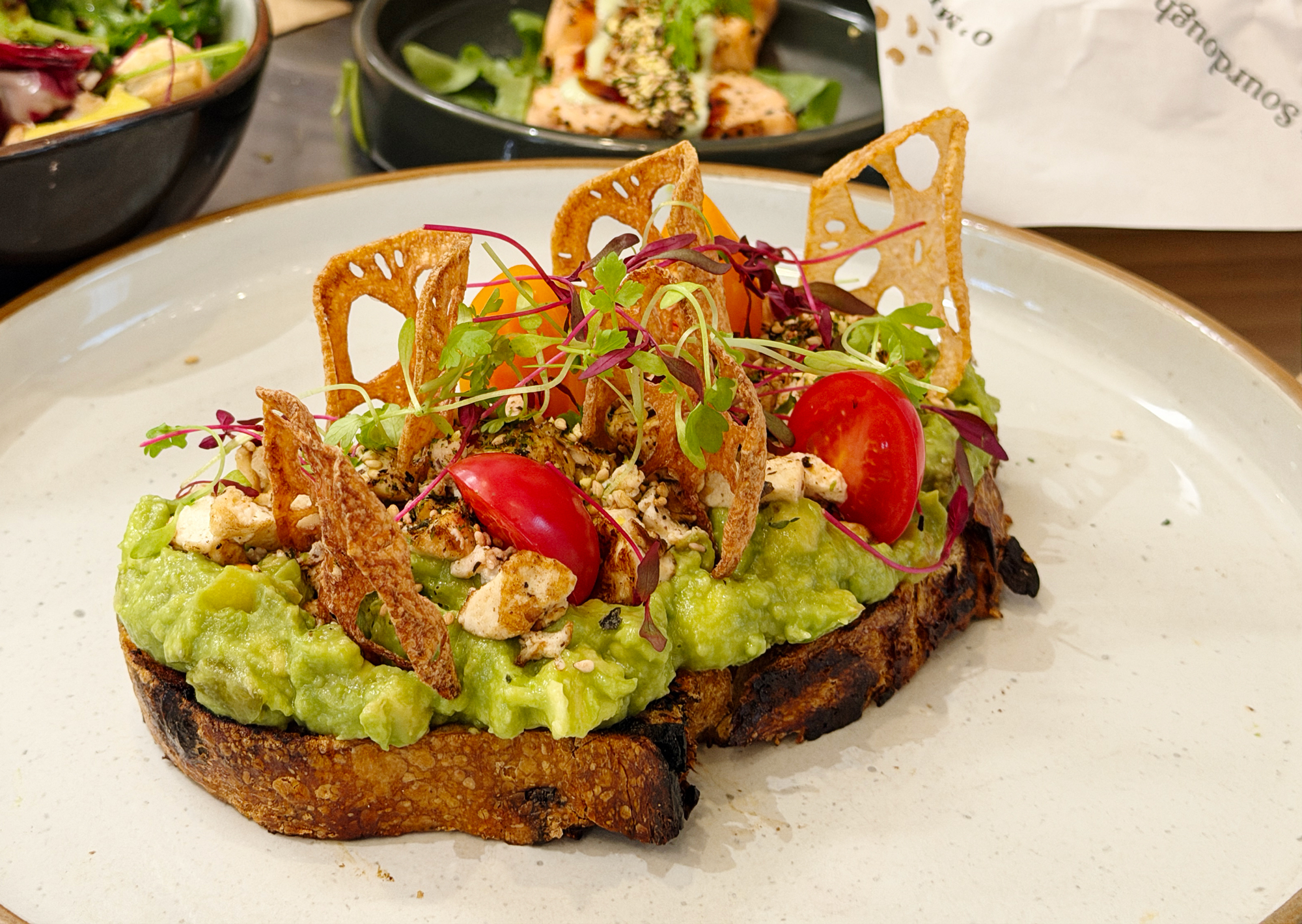 O’Mills’s sourdough bread is a must-buy for us every time we visit. We packed a sourdough bread first and were attracted by the tofu variety on the menu. We ordered all the tofu dishes in one go: an open-faced black garlic countryside bread sandwich topped with tofu, lotus-root and avocado , a tofu avocado salad, and a serving of salmon.