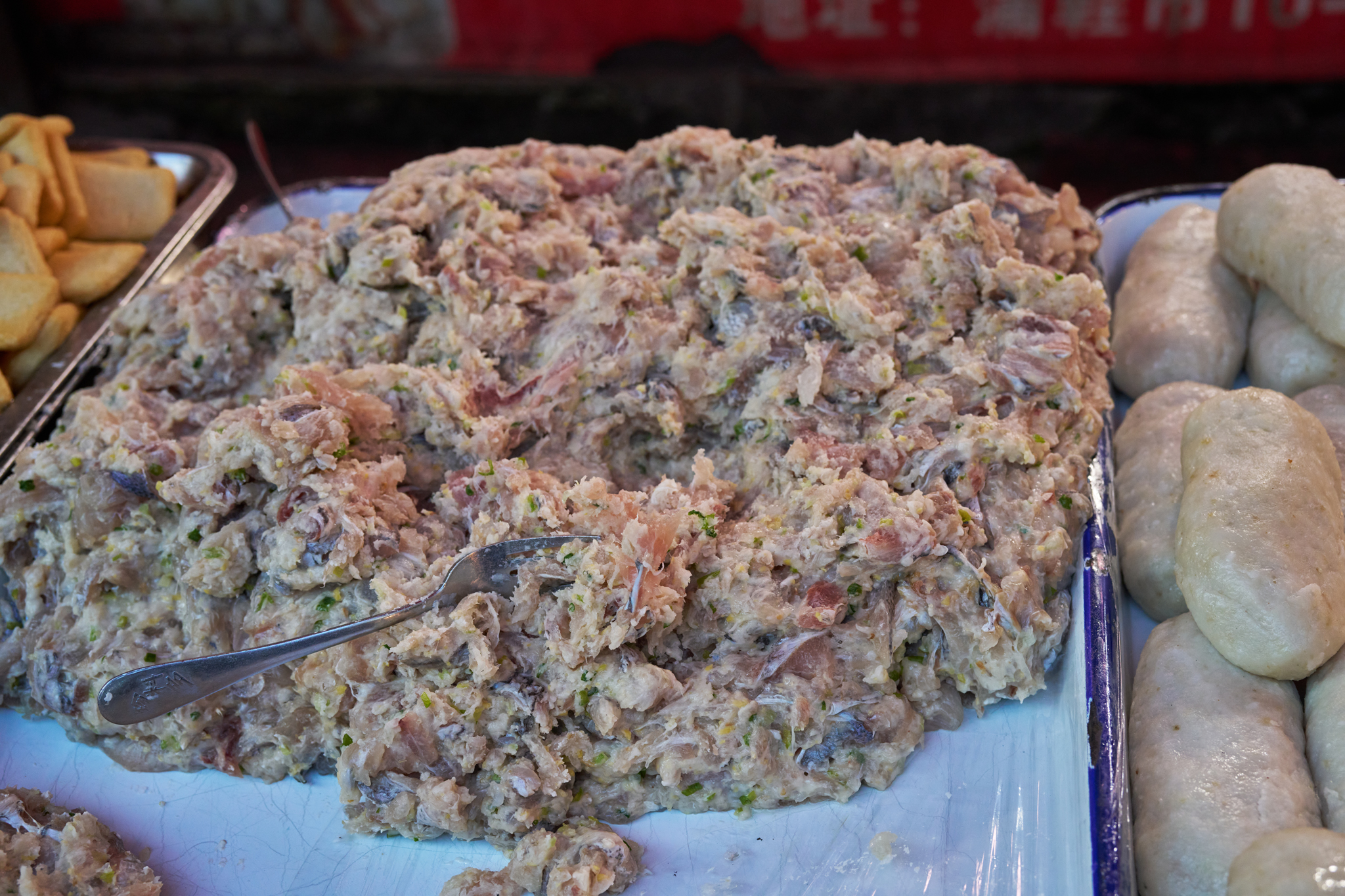 However, these fish cakes and fish balls are different from others places: the fish cakes here are processed into long strips; while Fish balls, on the other hand, have no shape and sell in form of seasoned fish meat fillings.